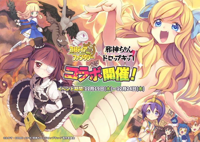 カルディアファンタジーが邪神ちゃんドロップキックコラボを2020年11月19日から2020年12月24日まで開催します。ガチャで「邪神ちゃん」「メデューサ」「ぽぽろん」「花園ゆりね」が登場します。スキンが販売されました。イベントでコラボ装飾を獲得できました。チュートリアルクリア時点のガチャ回数は5回、ガチャ確率は1.28%でした。