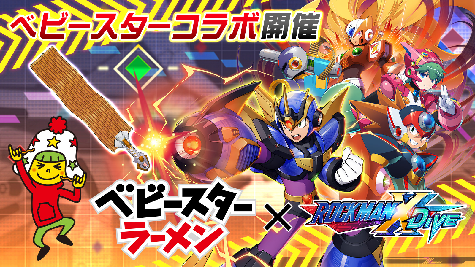ロックマンX DiVEがベビースターラーメンコラボを2021年5月19日から2021年6月16日まで開催します。イベントで「ベビースターラーメン大剣」「ホシオくんカード」を獲得できました。
